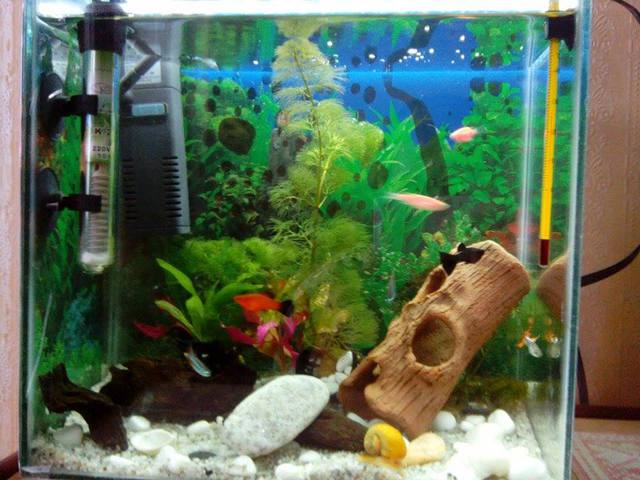 В този литраж на аквариума, е най-добре да се ограничиш само с неони и данио.