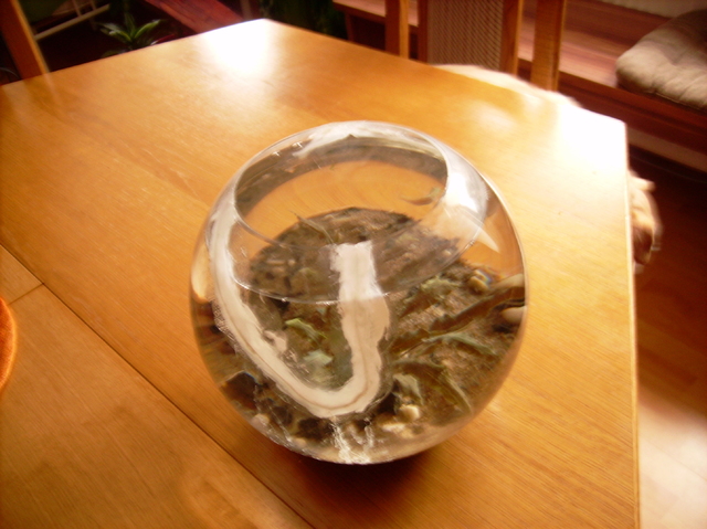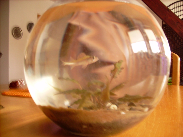 Искам да споделя нещо.Преди половин година в желанието си да запаля едни приятели за хобито им подарих една колба(6л.) с малко пясък и един стрък криптокорина уендити браун.Дори им направих и осветление -едно диодно фенерче без батериите вързано директно на зарядно за телефон.До тук добре,но те поискаха и рибки-обясних им ,че това дори и е забранено със закон(гледането на риби в колба),но те не....Е и аз не,но след 2 седмици бяхме на едно езеро да пиинем и хапнем и след две бири(толкова ,аз карах) видяхме дребни рибки до брега.След три опита с наилонова торбичка успях да хвана едно малко костурче,не повече от 3 см.Те казаха ,че ще си го гледат и аз се съгласих с мнението,че след като го уморят за няколко дни ще мирясат или поне за следващите си опити ще си купят нещо истинско като аквариум де.Да ама не-в момента същата тази рибка вече 6 см. седи пред мене в същата колба-все още без филтрация  и неколкократно лепена колба(ами инциденти,все ще се спънат в кабела на осветлението и фенерчето ще падне( то е с магнит и е залепено за металния рафт над колбата) и спука колбата.Не си мислете ,че са изоставили рибето-казва се Минчо :-D,просто днес заминаха за 2 седмици за БГ.Сега аз се грижа за него-водата му се сменя всеки божи ден.Явно следващата стъпка от моя страна е като се върнат да им го върна с аквариум и филтрация-днес на битака нямаше за моя изненада,но имам две седмици.