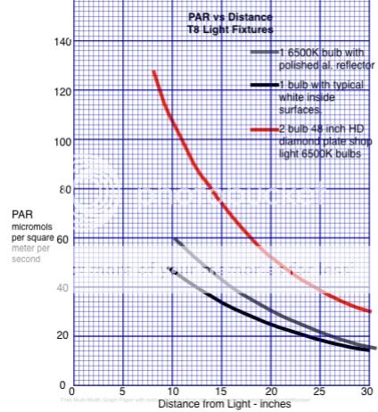Нямам представа колко лампи имаш, но спрямо тая графика (измерена е на сухо, но според автора под вода стойностите намаляват с около 10-20%), ако имаш 2 лампи и са ти на 10 см от повърхността, а дъното ти е на 60 см от лампата, то на дъното имаш под 30 пар, а на повърхността ще имаш... извън графиката е, но ако се интерполира липсващата част излиза, че ще е бая. Може би няма да е правилно съвсем точно да се интерполира, защото при много близко разстояние само лъчите от едната лампа ще са сравнително перпендикулярни, на другата ще падат под доста кос ъгъл и ще се губи от нейния поток заради отражения от водната повърхност. Но дори да приемем, че в най-горния слой влиянието ще е само на една лампа, и интерполираме за целта една от черните криви, пак ще получим повече от 100 пар. Иначе казано, толкова дълбок аквариум е трудно да се освети равномерно във височина. Май трябва бая да се повдигнат лампите, но тогава пък ще трябва да им се качи мощността, за да се компенсира това отдалечаване.
