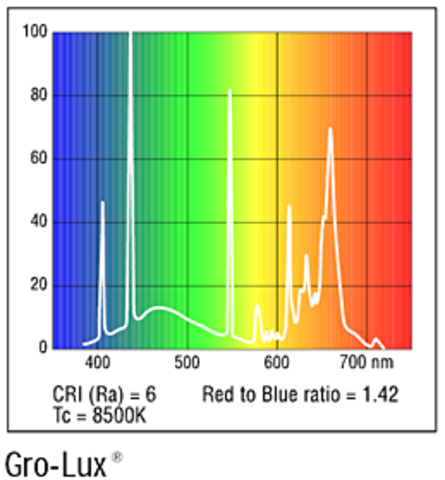 Да  Lux-метър измерва светлината основно в зелена част, но това не означава, че синия и червен спектри в " дневните" лампи е малко за растежа на растенията. В случая се измерва не целия спектър, който се използва от растенията. Лампите с нормално цвето предаване " дневните " освен големия пик в зелената област винаги имат и големи пикове в червената и синя части от спектъра ( графика на спектрален състав на лампа):