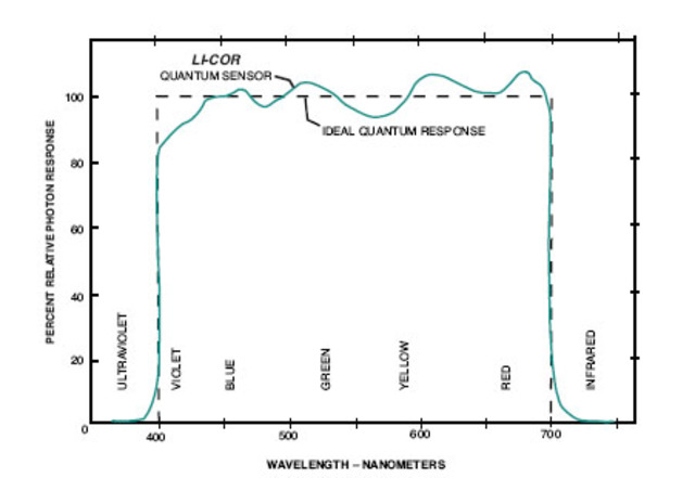 Това означава, че идеалният  PAR-метър да показва точни данни НЕ ТРЯБВА да бъде чувствителен само в червен и син части на спектъра. Колкото по - равномерно измерва PAR в целия видим спектър ( включително зеления ) - приборът става по - точен. Всяко отклонение от идеалната крива ( пунктираната линия ) :