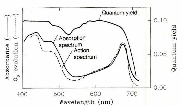 Измервания в зависимост от дължината на вълната за наземни растения показват, че ефективността на фотоните в диапазона  400-680нм е почти еднаква  (см. Taiz and Zeiger, 1991 Plant physiology, Benjamin/Cummings, Redwood City, CA)