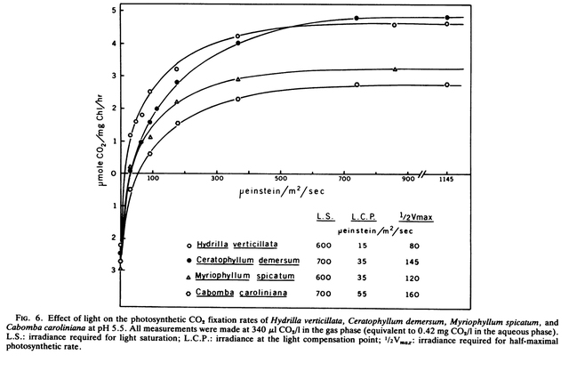 В изследването  Comparison of the Photosynthetic Characteristics of Three Submersed Aquatic Plants се разглеждат растения  Hydrilla verticillata/Ceratophyllum demersum/Myrophyllum spicatum/Cabomba caroliniana имащи LSP при по - високи стойности на PAR, но дори за тях двойни или тройно по - ниски стойности PAR също ще бъдат достатъчни. Ако при вас на повърхността на водата  PAR=150µmol·m²·sec, което съответства ~11.000Lux за флуорисцентна лампа Т5 студена дневна светлина, то по - голяма интензивност в повечето случаи не е нужна. Ако осветеността на повърхността е по - ниска от LSP за даден вид , това не означава, че той няма да расте. Бавният или забавен растеж в повечето случаи довежда до един по - добър външен вид на самото растение и повишава стабилността в аквариума.
