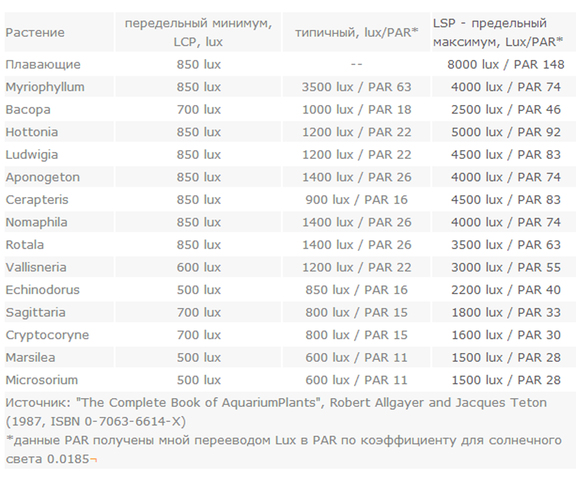Данные о потребности в свете разных видов растений - naturAcquario.net.
