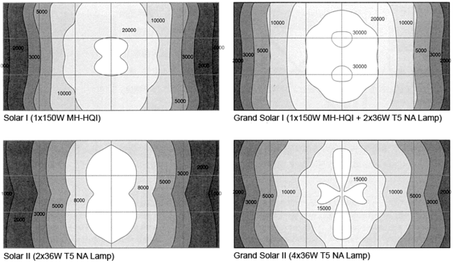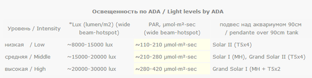 Относно еталонното оборудване ADA измерванията на Том Бар показват, че за ADA Solar I  - PAR=150µmol·m²·sec  на повърхността и PAR=30-40µmol·m²·sec на дъното. Дори при загуби в дълбочина от 30см на 50%, под  ADA Grand Solar II с 15000luх на повърхността на водата, светлината ще бъде пределна  (>LSP)  дори за дългостеблените растения!