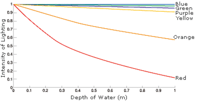 - загуба на светлина под вода с увеличаване на дълбочината