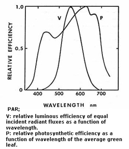 " Тези които са се сблъсквали с фотосинтезата знаят, че по - рано има няколко опита да се определи каво точно е PAR, но консенсус все още не е постигнат. Аз считам, че вече имаме факти,  които могат да обосноват едно рационално решение по - този важен въпрос. Както всеки ученик знае хлорофила е тази магическа субстанция, която кара растението да расте. Той също трябва да знае, но много често това не се казва, че за това трябва и голяма помощ от пигменти от друг цвят, особено жълти. Резултатът е, че кривата на спектъра за фотосинтезата е доста плоска практически в целия видим спектър  (400-700nm).  Разликата между различните растения е много малка, защото те имат един и същт фотохимичен механизъм. Дори фотосинтетическата ефективност на синята светлина да е по - малка от червената, практическата ценност на това значително намалява, защото растенията никога не растат под монохромна светлина, а винаги под светлина, която съдържа и двете дължини на вълната. Също така здрави и красиви растения поглъщат целия видим спектър от светлината, че разделението на отразена и погълната светлина губи всякакъв смисъл.