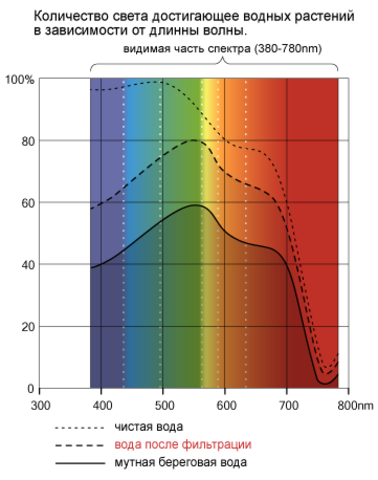 Растенията много по - ефективно използват зеления и син спектри, а не червения, както се считаше по - рано. Светлина с преобладаващ червен спектър освен изкривено цветопредаване влияе лошо на растежа на растенията - намаляване размера на листа и издължаване на стъблата. Растенията се приспособяват към изменията в спектралния състав на светлината в течение на деня. При подбор на лампи за аквариум са подходящи всички обикновени с цветна температура  5000-8000K и висок светлинен поток.
