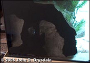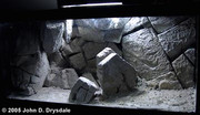 Не се бойте да изрязвате прорези между скалите, които на места преминават изцяло през материала. Ако боядисате задното стъкло на своя аквариум в черно... това ще създаде илюзията за много дълбоки пещери или цепнатини. Аз придвижих идеята дори една крачка нататък и направих няколко големи прореза, които извеждат в кухи каверни зад стиропора. Тези каверни могат да служат като дом за вашите риби и помагат да се намали изместването на вода, предизвикано от фона. Извън протокола: запомнете, че ако някоя риба реши да се крие в такива пещери, никога няма да можете да я хванете. В моя случай аз не бях притеснен от това, тъй като в моя съд смятах да отглеждам само видове, обитаващи раковини, но пещерите могат да са проблем за видове, които обитават такива. Просто за всеки случай, оставих стъклото точно зад пещерите небоядисано, но покрито с черни капаци, които могат да се махат, така че да мога да видя която и да е риба, която се крие... може да е готино за наблюдаване на хайвера на такива видове, които хвърлят в пещери!