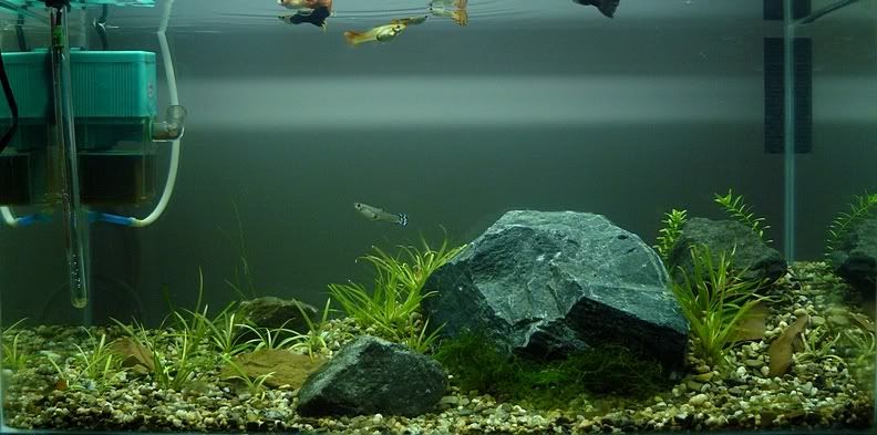 Харесва ми. Само една забележка гледам, че си сложил два различни вида гупи, всичките ми изглеждат чиста линия. Махни жълтите и остави само черните гупи, иначе ми изглеждат прекалено шарени.