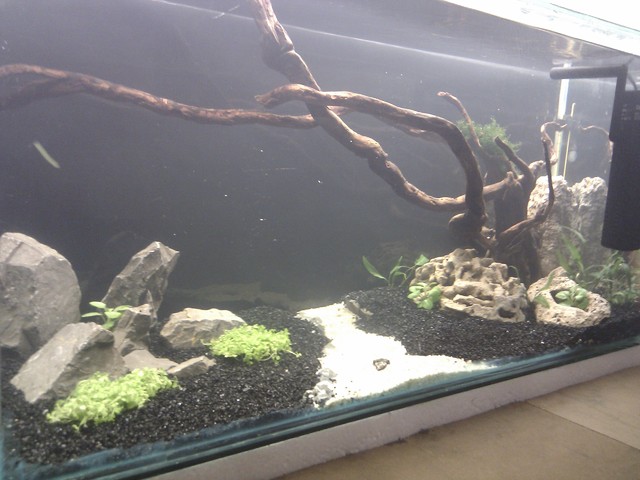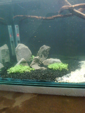 Здравейте,  *DRINK* стартирам нов аквариум с идея за акваскейп... Това ми е първият толкова голям аквариум така, че искам малко съвети от по-опитни съфорумци. От няколко дни сменям води, промивам пясъци, събирам камъни и така. Днес се беше избистрила водата, та реших да направя малко аранжировка(да я поразмътя пак с една дума) 4 часа главоблъсканица  :duvar:.  Направих три снимки, но със служебния телефон та е с ужасно качество, утре ще направя по-добри, но за сега вижте тези  *thanks .