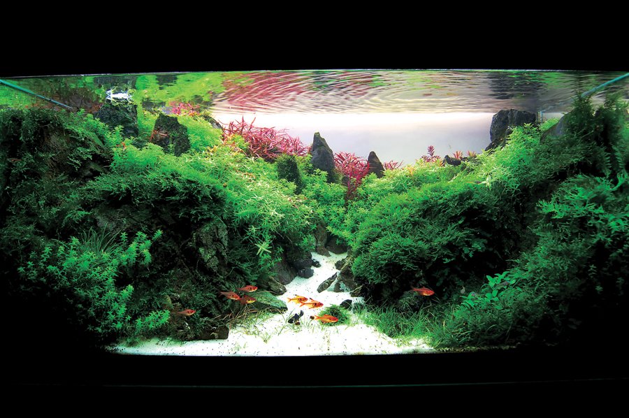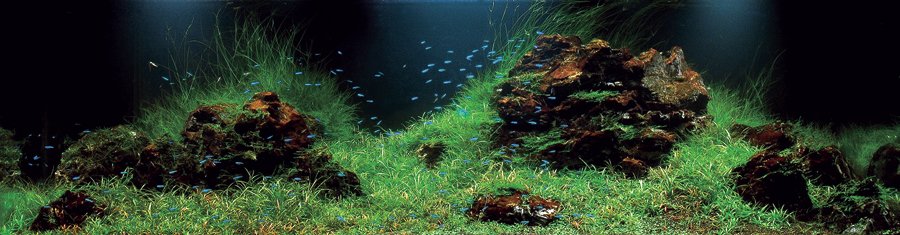По принцип си прав, но работата хич не опира само до затъмняване на предния фон. Има компоненти, които трябва да се съчетаят да добър резултат, например размер и форма на компонентите(камъни, клони, растения че и риби даже), отстояние на фона("отпушване" на аквариума), подсветки(правилно използване), цветове дори. В един аквариум илюзията за дълбочина е пряко свързана с илюзията за големина. Изобщо нещата са доста специфични, защото се снима малък затворен обем пълен с ВОДА(не въздух), осветен с изкуствено осветление и в тъмна стая. Май условията повече отиват на портретно студио, отколкото на природен пейзаж. Не знам Амано какво мисли по въпроса, но пък той има един килер, пълен с фотографска техника(някъде бяхме пускали снимка), че е и профи.
