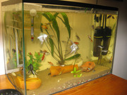 Малеееее...!!! Аз жсъщо съм начинаеща в 40 литра гледам 9 рибки средно по 4-5 см ,а ти ? погледни на черната скалария перката ли там каквото е стърчи извън водата това ако не е тормоз аз на твое място бих оставила 10 гупички няколко сомчета и това е !
