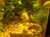 ето даже не съм успял да разбера , че е лабиринтова . Рибката е чисто бяла и много малка . Магазинера каза че много лесно се развъжда , че даже клиенти му ги носели щото ставали много . И сега се чудя тва животно дали ще ми къса от растенията дали ще ги рови и т.н.