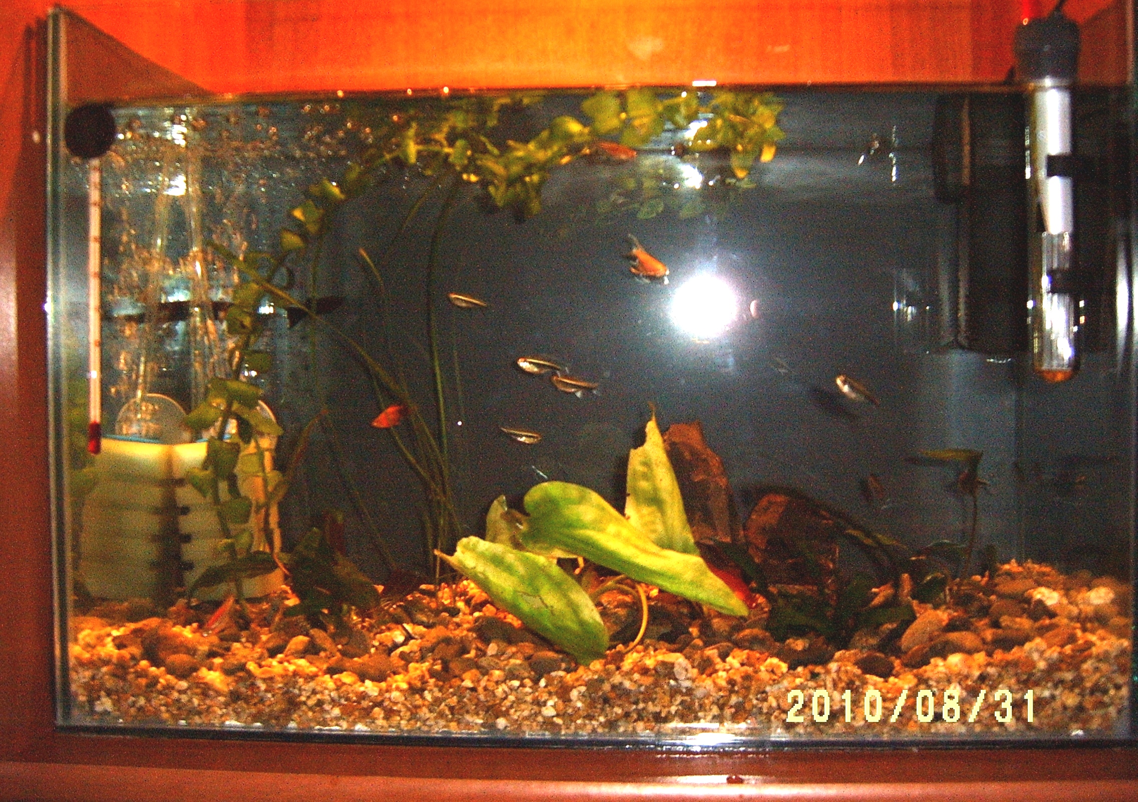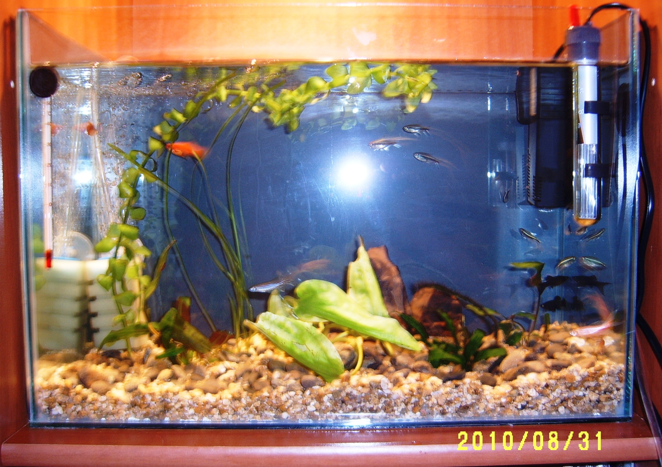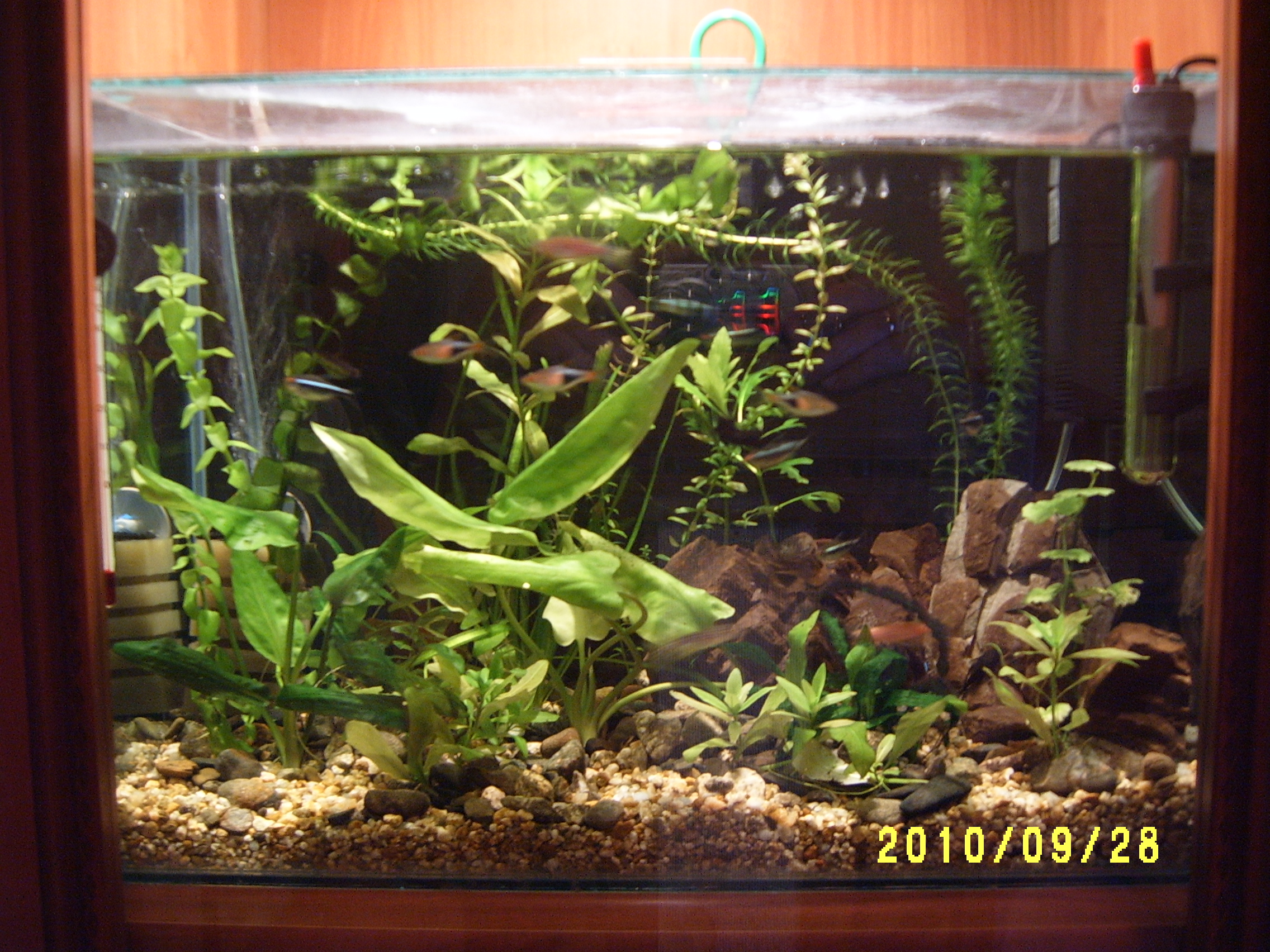 Какво направих. Измих грунда, налях вода престояла 3 денонощия, засадих растенията сложих вътрешния филтър и аериращата помпа и след като се избистри достатъчно водата пуснах рибките, някъде след час! Знам грешка, но късно почнах с четенето. Рибките са 1 хелер, 1 плата, 3 данио, 2 молинезии и 8 черни неона! Това беше понеделник сега сме петък, значи преди 4 дни! На третия ден смених 30% от водата, на четвъртия сложих във водата sera Aquatan - подобрител за вода 20мл. мисля и sera Toxivec 7.5мл. Във вътрешния филтър сложих активен въглен sera super Carbon за да обере токсините. Храня ги веднъж само сутрин със sera Vipagran и Tetramin като ге редувам през ден. Смятам неделя да ги оставя гладни! За сега всичко изглежда наред, рибките са активни с ярки цветове, но ме притеснява азотния цикъл да не ги отрови. Какви мерки бихте ми препоръчали да взема занапред за да избегна натравянето на рибките! Ето и снимки на аквариума, капак съм поръчал само стъклен, осветлението ми е луничка, която е на 40 см над него и осветява доста добре: