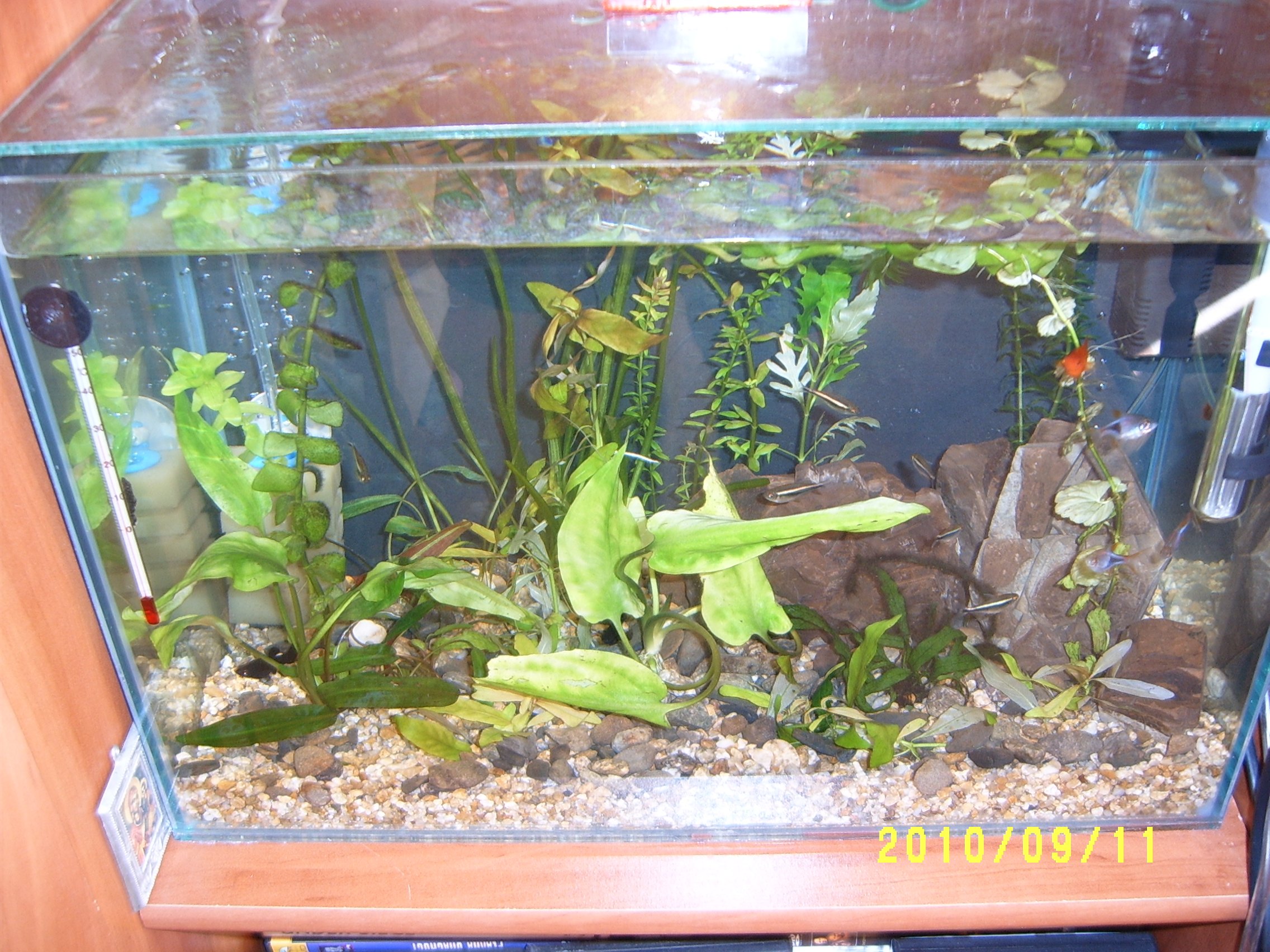 Чудя се да махна ли гъбата на аераторната помпичка, имах една жертва още на втория ден от нея. Един неон се беше заклещил между гъбата и стъклото и е умрял, и се наложи да я изтегля малко . От тогава до сега нямам проблеми. Добавих растения и взех 3 разбори (последните в магазина) и 2 малки анциструса! Смятам това ще е максимума от риби, повече няма да пускам, даже искам да махна живородките, но дъщерята не дава :)