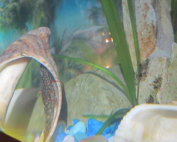 Днес забелязах рана в началото на едната перка на  анциструса. Той е около 5 см в малък аквариум с гупи. Моля ви, ако можете ми да помогнете, защото съм начинаеща. Снимка: