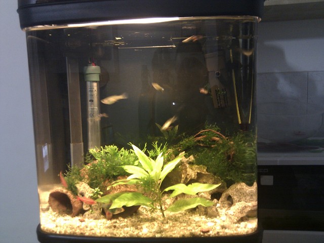 Това са снимки от 16.01.2015  сега е друго.... Върнах барбусите в магазина, преместих 4 гупи в друг аквариум, та новите обитатели са 4 червеноноси тетри май бяха и 2 женски черешови бабрбуса от 17.01.2015.........Ще кача снимки на сегашният резил малко по-късно.... А и 2 нови растения.