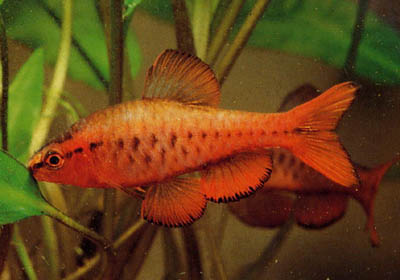 Разпространени са в Малайзия и Индонезия. Обитават спокойните водоеми в равнините. Дължина до 5 см. D 3/8, А 3/5, ll 22-25. Тялото е удължено, страничната линия е пълна. 2 двойки мустаци. Гърба е червено-кафяв, отстрани са жълто-кафяви, корема е жълтеникав. По тялото минават 5 черни напречни ивици , средната под "D" е кратка, клиновидна. Плавниците в основата си са тъмно-червени, в основата на "D" има черно петно. При самеца червената окраска е по-наситена. Рибите са мирни, стадни, обитават долните и средни слоеве на водата. Препоръчително е да се отглеждат не по-малко от 10 екземпляра. Аквариум с дължина от 10 см с засадени и плаващи растения, създаващи тъмни места. В много осветен, беден на укрития аквариум рибите са страхливи. Вода: 20-25°С, dH 4-15°, рН 6-7, не обичат свежа вода. Развъден аквариум с дължина от 30 см за двойка. Самеца трябва да е на повече от 1 година. Вода: 25-27°С. Самката хвърля до 300 зърна. Инкубационен период около 1 денонощие, малките плуват след 4 денонощия. Полова зрялост след 7-9 месеца.