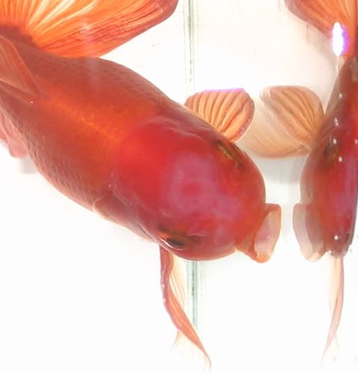 На снимките налепа изглежда с цвят малко по-блед от цвета на рибката, но предполагам това е ефект от светкавицата. Налепа е светло бял и се откроява ясно в сравнение с червената глава и оранжевото тяло.