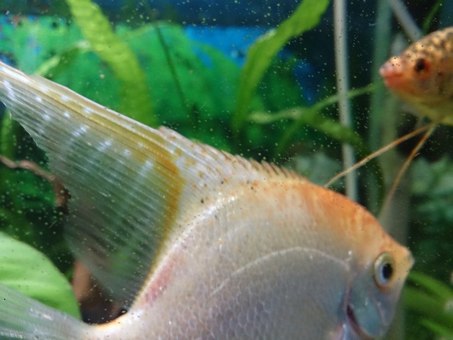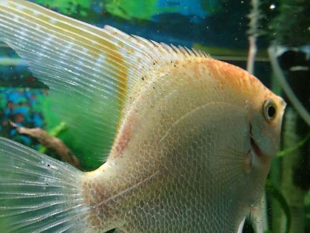 От вчера забелязах , че скаларията ми се държи странно . Беше в единия ъгъл на аквариума и стоеше долу ниско и диша бързо сякаш не и достига въздуха . От моменти стои на повърхността с главата нагоре сякаш пак не и достига въздуха и диша отгоре . Забелязах днес , че има някакви черни точки по нея не са много , но се виждат .