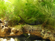 Тези дни направих един малък черноморски аквариум - 55х25, в.35, - 48 л. Около 8 см. грунд само от едра фракция пясък от прибоя при Оазис/Северният плаж на Несебър/ - малки камъчета, натрошени миди, смесено със сравнително едър пясък. Водата беше 20 градуса и извадих живи камъни от около 2 м. дълбочина, общо около 15 кг. Камъните по-живи от идеите на Ленин - обрасли със  ситни миди и няколко вида водорасли, от тях се пръкнаха 3-4 дребни рачета и всякаква друга гад, плуваща и пълзяща. Специално ги избирах да са малки, заради размера на аквариума. Освен камъните аквариума събра и около 30 л. морска вода. Оборудването е една помпа от 1200л/ч с дюнапрен, която върти водата със страшна сила. Целта ми беше да пробвам първо дали водораслите ще се задържат по камъните. Интересно, течението ги развява като знаме, но те си седят. Не съм им сложил още лампа и им пускам по няколко часа дневна светлина/дърпам пердето/. Водата е кристално чиста, а водораслите в цветущо здраве. Въртях камъните по всякакъв начин, те пусках струята да върти всичко, ту слагах камък пред отвора на помпата, все едно засега държат, даже морската салата, която се откъсна/части от нея, повечето си седи по камъните/ си живее около помпата.
