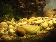 Скаридите - железни добичета. Никакви проблеми и грижи за тях. Спокойно могат да се слагат повече. Очевидно си намират храна, защото единственото, което слагам в аквариума е чернодробна. Има една малка, която непрекъснато се движи, големите се окопаха в камъните и излизат отвреме на време.