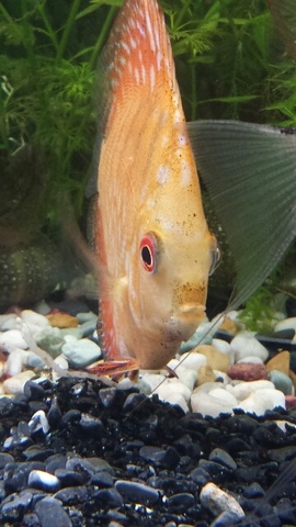 От известно време забелязах бяла точка наподобяваща гнойна пъпка по главата на този дискус.Освен това напоследък започна да страни от останалите и не се хранш толкова колкото преди.Изпражненията му са белезникави и  дълго време не се отделят от дискуса. На мен ми прилича на хексамитоза , но нека някой специалист да си каже мнението по този въпрос.