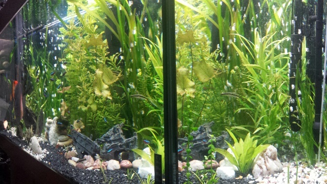 Аквариума ми и 450 литра. Има два външни филтъра sun sun 1400 л/ч и 2000л/ч. Има някжлко валиснерии, анубиаси, криптокорини и други бързорастящи но които не знам името.Осветлението е 2 пури по 54 вата, една диодна лампа и една 36 ватова пура.