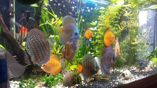 АВ аквариума има 13 дискуса.Два са на 2 месеца,2 на 3-4 м,6 на 6-7м.(включително и този),3 на 1,5 год. 17 неона и няколко сомчета коридорас и анциструс.