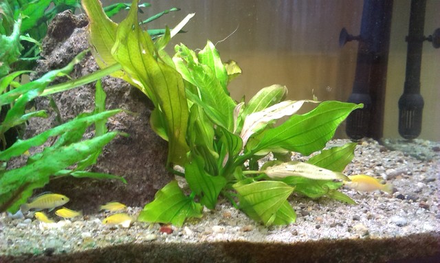 Скалариите гонят саулосите, освен това аквата се раздвижи . Личи си ,че има и риби в аквата.