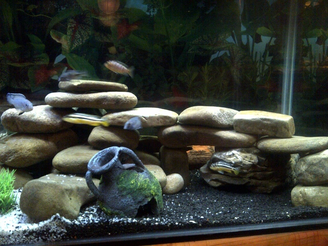 Ако сложиш едноцветен тъмен фон цветовете на рибоците ти ще се открояват повече.За този обем с толкова риби филтрацията наистина ще трябва да ти е добра.Делвите не ти трябват,укрития си направил с камъни.Махни и искуственото растение.В естествената им среда няма растения или поне сложи някое естествено (гигантска криптокорина,валиснерия).Грунда не е ли малко?Ако си само с този вътрешния филтър няма да станат нещата.