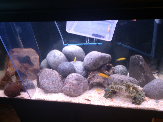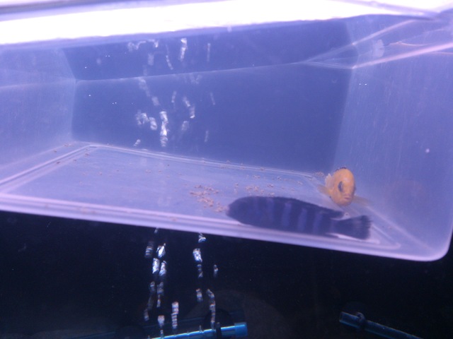 На дъното на кутията е храна, сложих малко повече. После я махнах. Имам 3 рибки от лабитохромиса с хлътнало коремче, така ги купих. Нормално,ли е? Мислите, ли че двете рибки и кутията имат шанс . Лабитохромиса е с нахапани перки от доминиращия мъжки, за това го отделих, а за демасонито, вече казах.
