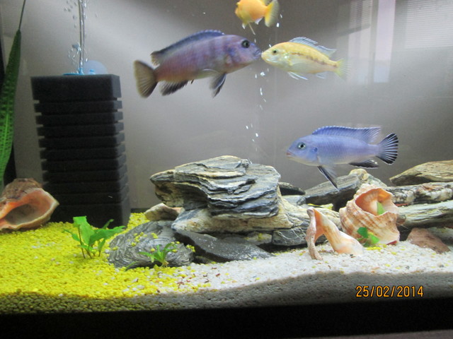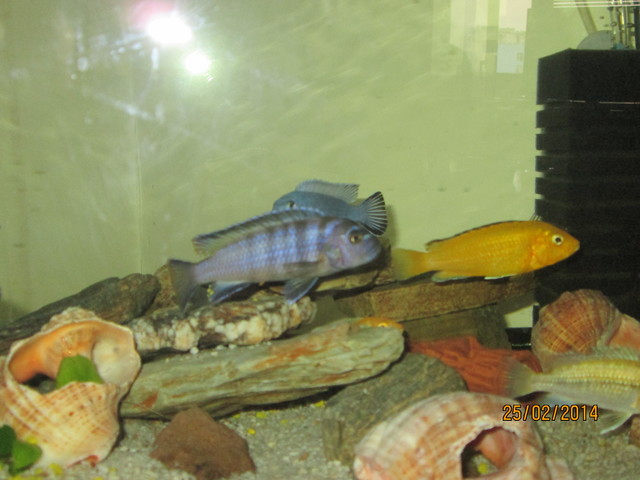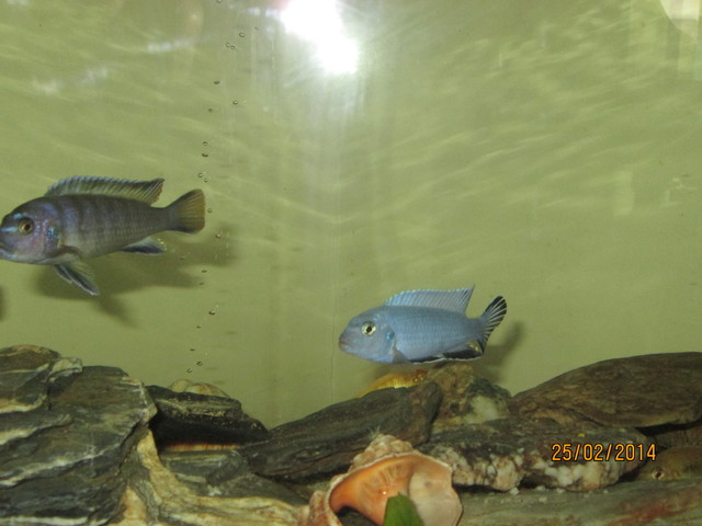 140л Видовете станаха много от незнание / имах Labidochromis caeruleus-жълтата и pseudotropheus saulosi-синята с раета/ но като търсих женска на pseudotropheus saulosi, в магазина ме метнаха,   и ми продадоха соколофи-то / която ми харесва повече от pseudotropheus saulosi/. Четох че живеят на ята и се спрях на тези два вида, но какво да ги правя другите ? Не ми се струва добра идея, да ги пусна във WC - то. Даже имам и една зебровидна цихлида / женска /.