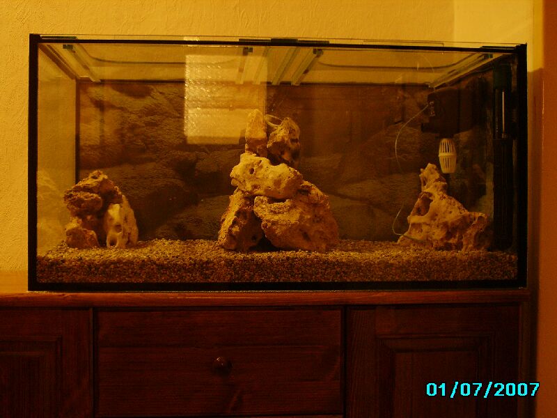 Като гледам варовиковите камъни, явно си се насочил към африканските цихлиди.Ето ти линкове към 2 доста полезни сайта:http://fish.mongabay.com/cichlids.htm, http://cichlid-forum.com/index.php.Бъдещия ми аквариум е със същите размери като твоя(още 10 дни), но тъй като предпочитам и растения да има се интересувам от южноамерикански цихлиди.Но знае ли човек на къде ще го отвее бъдещето....,затова ми е интересна твоята тема.