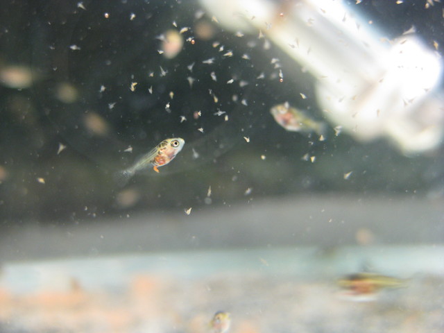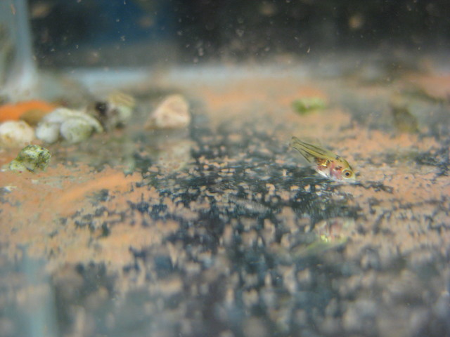 Поздравления! Растът мъниците  но дъното е много  мръсно. Тоест това е Артемия и като започне да гние става страшно за малките.  Почиствай поне през ден и доливай все още смесена вода-От големия аквариум и прясна.