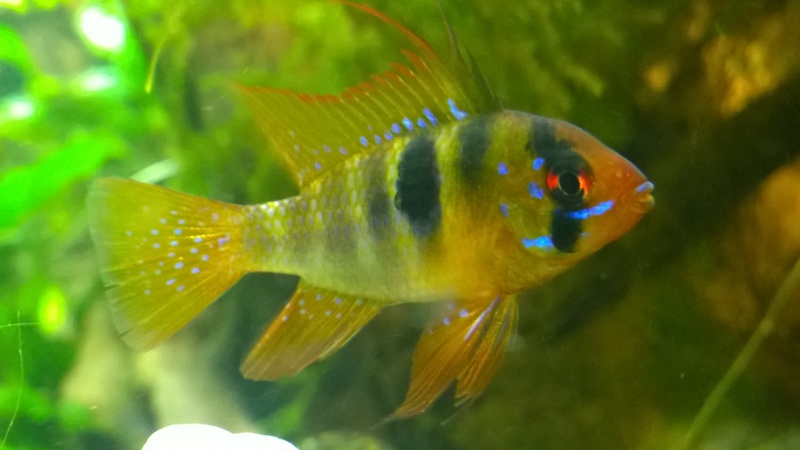 А относно половете - мацките рамирезки са с по-дребни и някакси събрани, с по-заострени муцунки, момчетата са с по-заоблено чело, мацките са с много по-категорично черно на първите 3 шипа на гръбната перка(които са по-къси отколкото при мъжките), по ярко е и черното през окото, и със сигурност сините точки в черното петно на страничната линия също показват ясно пола. Ужасно зли са - не харесват никого. Дори малките да не са оцветени, вече съм почти сигурна кои са девойките - злобата и агресията я проявяват вече от месец.