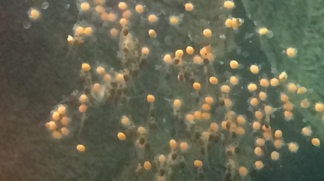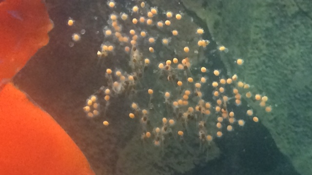 Това вчера го забелязах.Досега хвърляха доста пъти но без успех.Има доста малки личинки около 300 и те си ги гледат засега.Посъветвайте ме ако не правя нищо (понеже нямам време да се занимавам) дали ще си ги отгледат сами?Четох ,че те си ги хранят с кожен секрет и сами си ги гледат до определено време.А после дали ще папкат Тетра дискус?