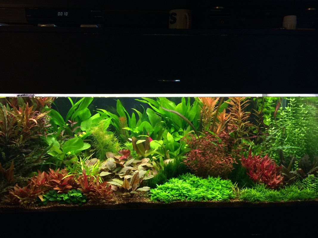 Аквариума е със осветление топла и студена бяла лед, около 0.35вата на литър. с цо2 и торене.