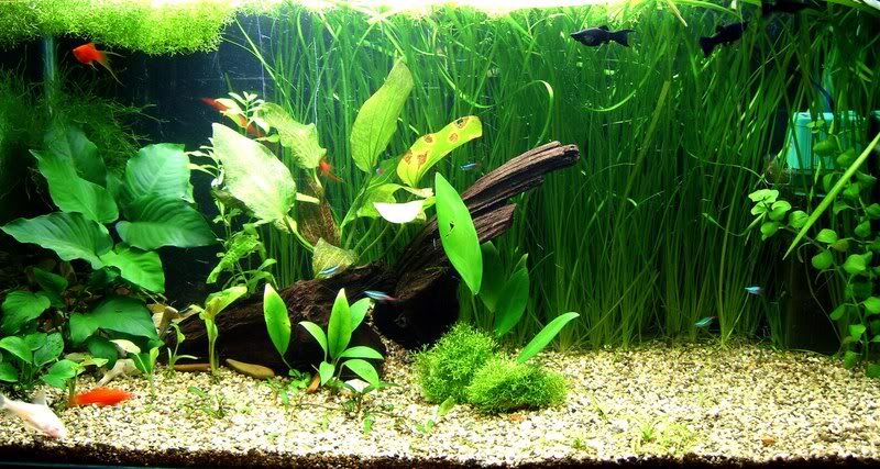 мисля че няма да е лошо да групираш растенията малко. В смисъл анубиасите ги сложи в една групичка, ричията също на групичка- малко на по-преден план(даже можеш да покриеш голяма част от дъното с нея :). Ехинодоруса му осигури повечко място, тъй като ще става доста голям. Криптокорините също можеш да ги групираш (от апоногетолистната не виждам смисъл да стои в аквариума ти). Повечко корени няма да са излишни :)