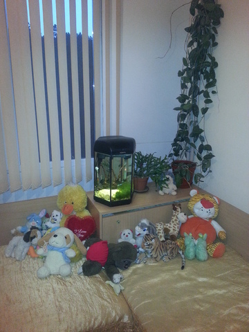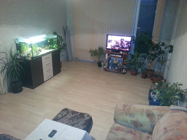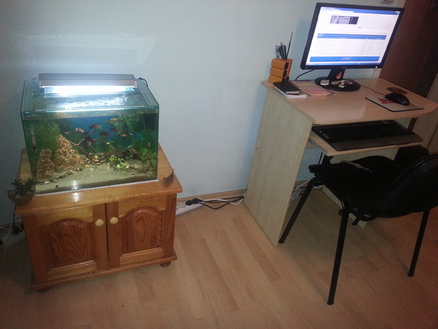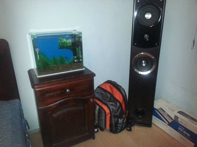 Ами да, имаше една колкона посредата на хола и реших да я затворя от двете страни с аквариумите и да си направя отзад стая и да складирам всичко около рибите там. Нямам време да затворя стената над единия аквариум, ама май така взе да ми харесва повече :)