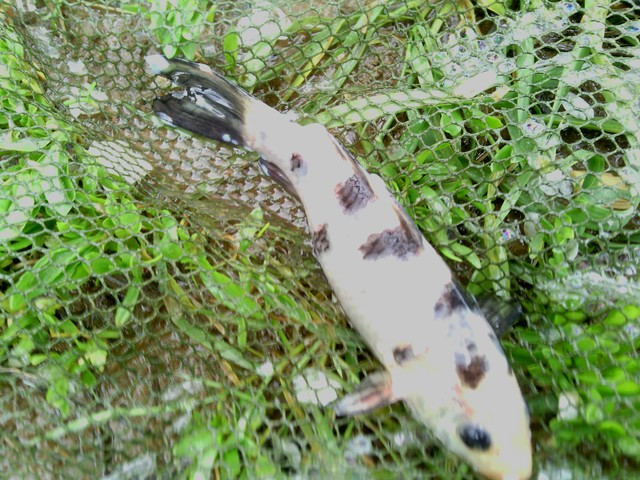По снимките не си личи понеже рибата е бяла и си снимал от далеко,но според мен това е гъбична инфекция инфекция ето една снимка на гъбична инфекция ако прилича на твойте петна ще коментираме лечението ако не направи снимка в по близък план на тъмен фон