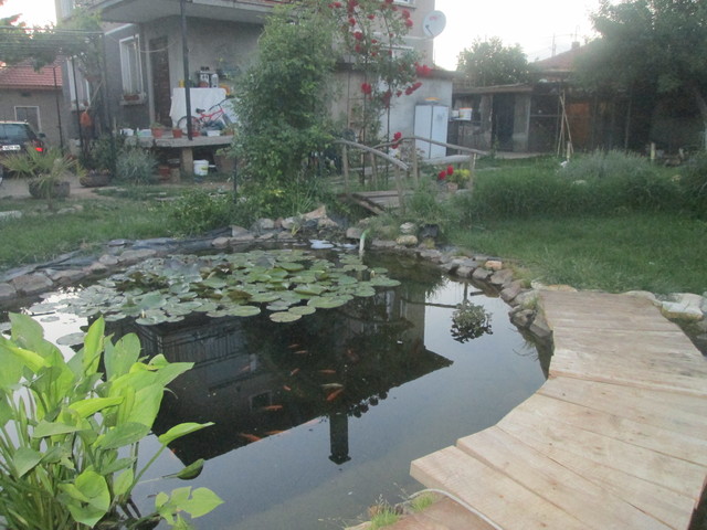 Страхотни растения наистина, но намери малко време и камъни да скриеш найлона. Първо е грозно и второ от слънцето се уврежда. Между двете езера може да сложиш мост със същите дъски, които си ползвал над филтъра.