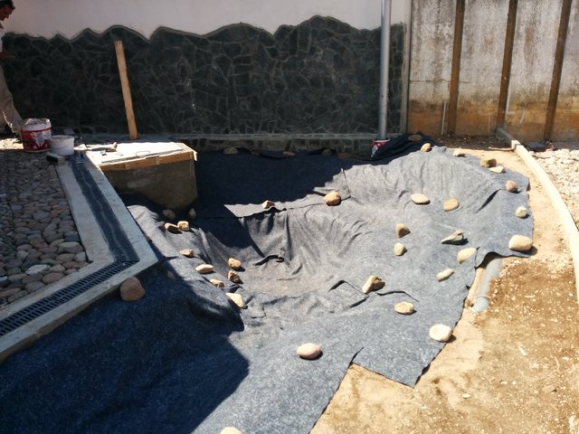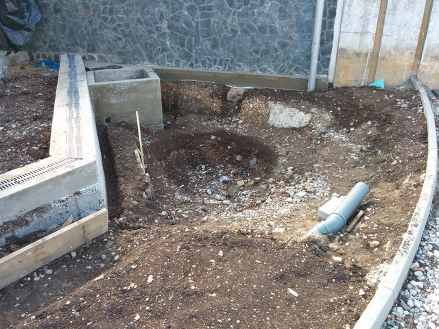Е, локвата вече е факт. Поради естествения наклон камъните и водата си смениха местата. Мислех шахтата за филтъра да е до водоскока, но забравих и се наложи да е на практика във водата. Това малко изяде от площта, предвидена за дупката. Така че изходният трап стана така: