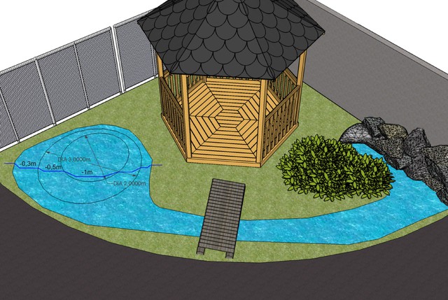 Идеята, илюстрирана лаишки в SketchUp може да се види на картинката. Грубото пресмятане на обема ми даде около 10 кубика (на практика сигурно ще са по-малко). Ще има и участък от 1м за евентуално зимуване на риби. От алпинеума в дясно ще извира водопадче и по ручейчето под мостчето ще се влива в езерцето - за красота и за аерация. Предвиждам и три типа растения по трите нива на езерото. Изкопът е в земя с подложка от пясък, геотекстил и геомембрана EPDM (черна). Водата ще циркулира от една помпа 5000 л/ч през филтър с UV лампа за 16 кубика езерце и още една помпа 5000 л/ч през деня директно във водопада за дебит. И двете са потопяеми, за да не правя сифон на дъното.