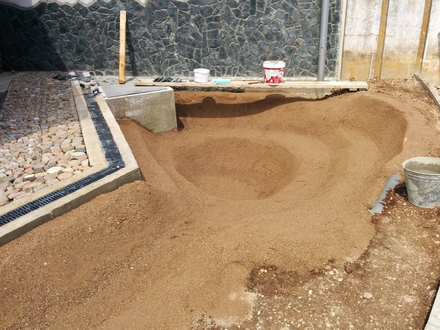 Е, локвата вече е факт. Поради естествения наклон камъните и водата си смениха местата. Мислех шахтата за филтъра да е до водоскока, но забравих и се наложи да е на практика във водата. Това малко изяде от площта, предвидена за дупката. Така че изходният трап стана така: