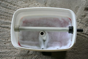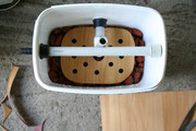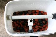 Филтърът е с най-долен слой от две натрошени цигански керемиди и 50 биосфери с диаметър 18мм пак от ebay. Над тях импровизирах нещо от балатум, чиято цел поне на теория беше да удължи пътя на водата през керамиката и биосферите преди да излезе от изхода на филтъра. Отгоре слой от фин дунапрен с дебелина 2 см. И над него сандвич от 6 слоя олекотена вата и едни памучни кърпи за бърсане на прах.