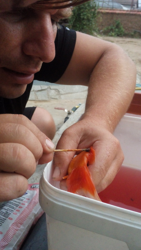 Здравейте , първи по-сериозен проблем с рибките появи се червей котва по телескопите и златните. Третирах езерцето с калиев прманганат 10гр. , а пациентите отделени за 3ч. за баня в разтвор от калиев перманганат и сол и почистване с пинсета. След почистването раничките туширах с клека за зъби памуче и мъничко йод за да не започне бактериална инфекция. Мисля да повторя процедурата с третирането на езерцето още веднъж след няколко дена. Знам че е най-добре с димилин но никъде не мога да намеря малка разфасовка. Ако някой знае от къде мога да намеря димилин 100гр. Моля да помогне или ако някой има повече ще си го платя ...