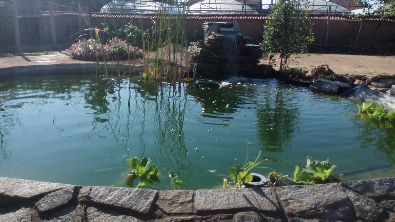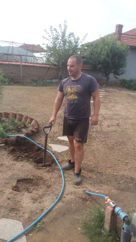 Преди месец реших да си направя езерце в двора тъй като плановете да садя райграс се отложиха от летните жеги , а така или иначе го бях запланувал за по-нататък. Първоначалните планове бяха да е нещо от сорта шадраванче метър на метър или два , но след като започнах да чета този форум понаучих някои неща за отглеждането на рибки в езерцата и изискванията за параметритеим та с всеки изминал ден го увеличавах и накрая се получи 4,5м на 5,5м на 1.8м. дълбочина. исках да го направя и по-голямо но в дълбочина ударих  на гадна лепкава глина а в ширина стигнах до тръби и кабели ... та толкова. Дъното е постлано със стари черги и мембрана за езерца , брега е повдигнат над нивото на земята с 30см. бетониран и облицован с камък , направих преливник при силни валежи , направих скимер от канализационни тръби и стойка от стар вентилатор , купих помпа HAILEA 200w 15 000 l/h която смуче без проблем през скимера и от дъното чрез два кръга тръби без проблем прекарва водата през филтъра(200л) бидон и прави водопадче. Смукателната тръба на помпата я разделих на два кръга с отделни кранове за да мога да регулирам от къде колко да смуче по мое желание и нужда. Остана да наредя камъните на водопада.