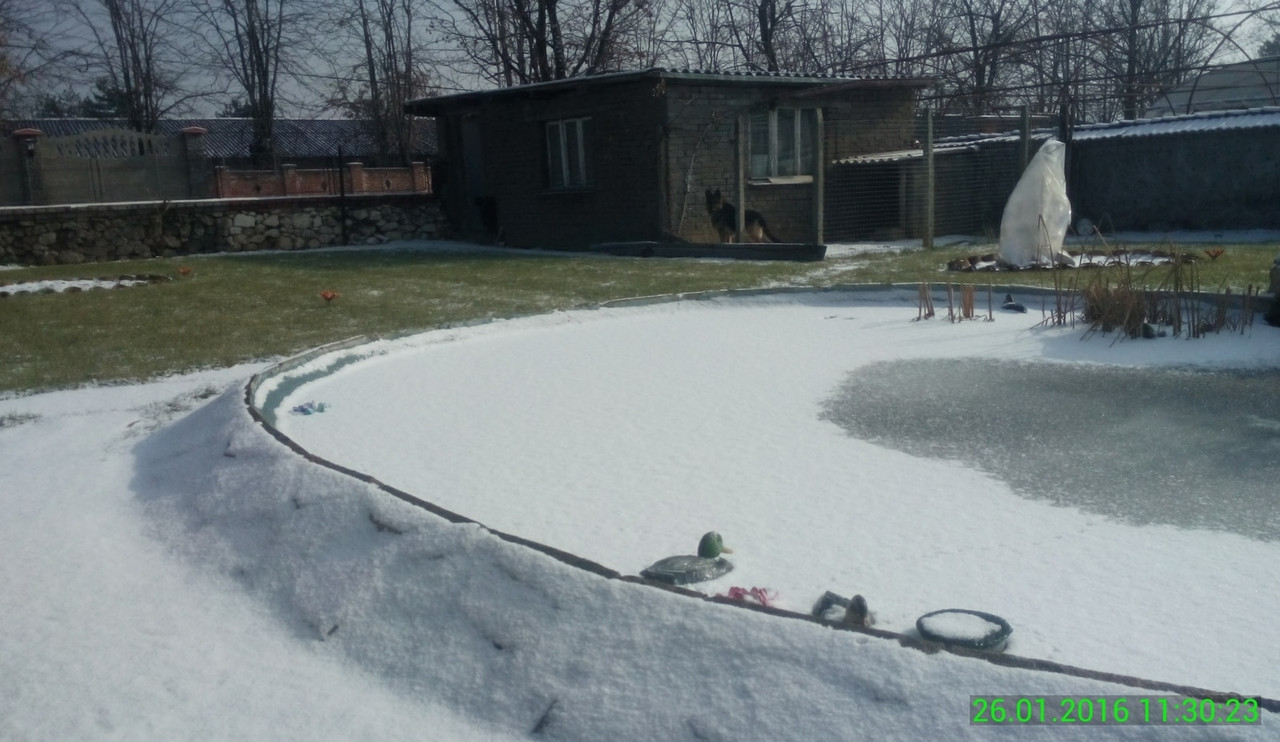 Здравейте пичове и за много години. Днес е 01.01.2016  и температурата сутринта като се прибирах от работа беше минус15. Резултата е 3см. лед по цялото езерце , добре че спрях помпата преди два дни като видях че взе да се образува коричка. Рибите са наред дори телескопите и си плуват спокойно под леда , а пласмасовите мюрета(патици) които сложих преди месец , освен че красят играят роля и на пластмасови бутилки като не позволяват образуването на плътна ледена кора (поне за сега де) и ми спестяват правенето на отдушник. Не мисля да разтапям леда освен ако не се задържи така студно за дълго време което не вярвам, според мен леда е полезен един вид каляване на рибите и убиване на разни бактерии и вируси във водата: